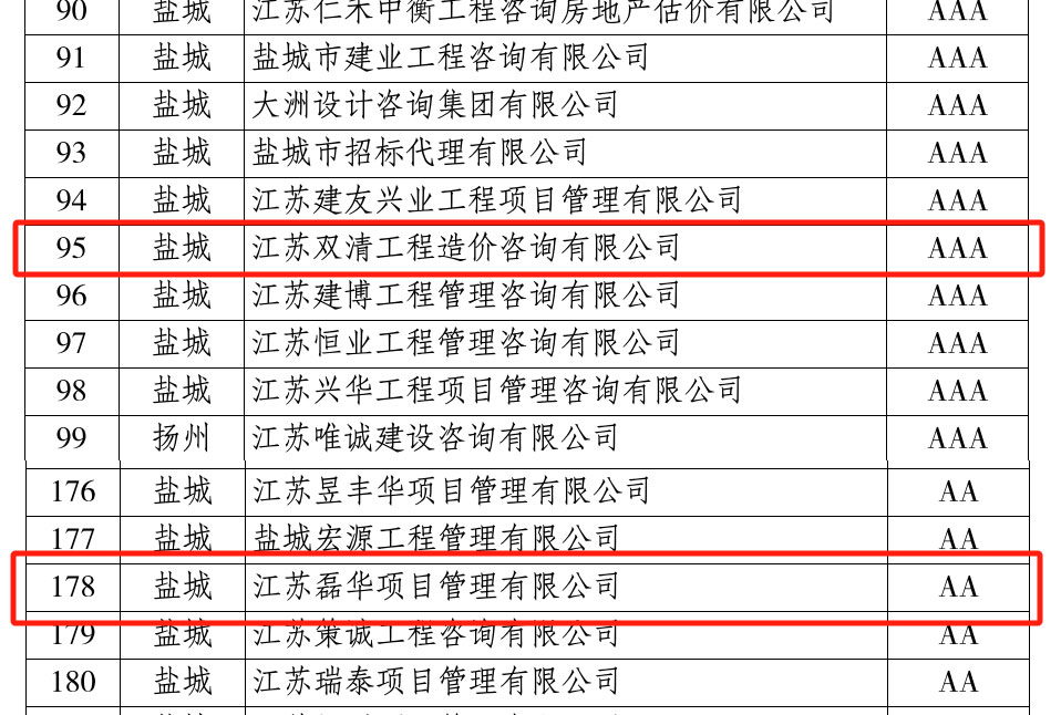 江蘇磊華項目管理有限公司獲得省AA級招標(biāo)代理信用評價、江蘇雙清工程造價咨詢有限公司獲得省AAA級招標(biāo)代理信用評價